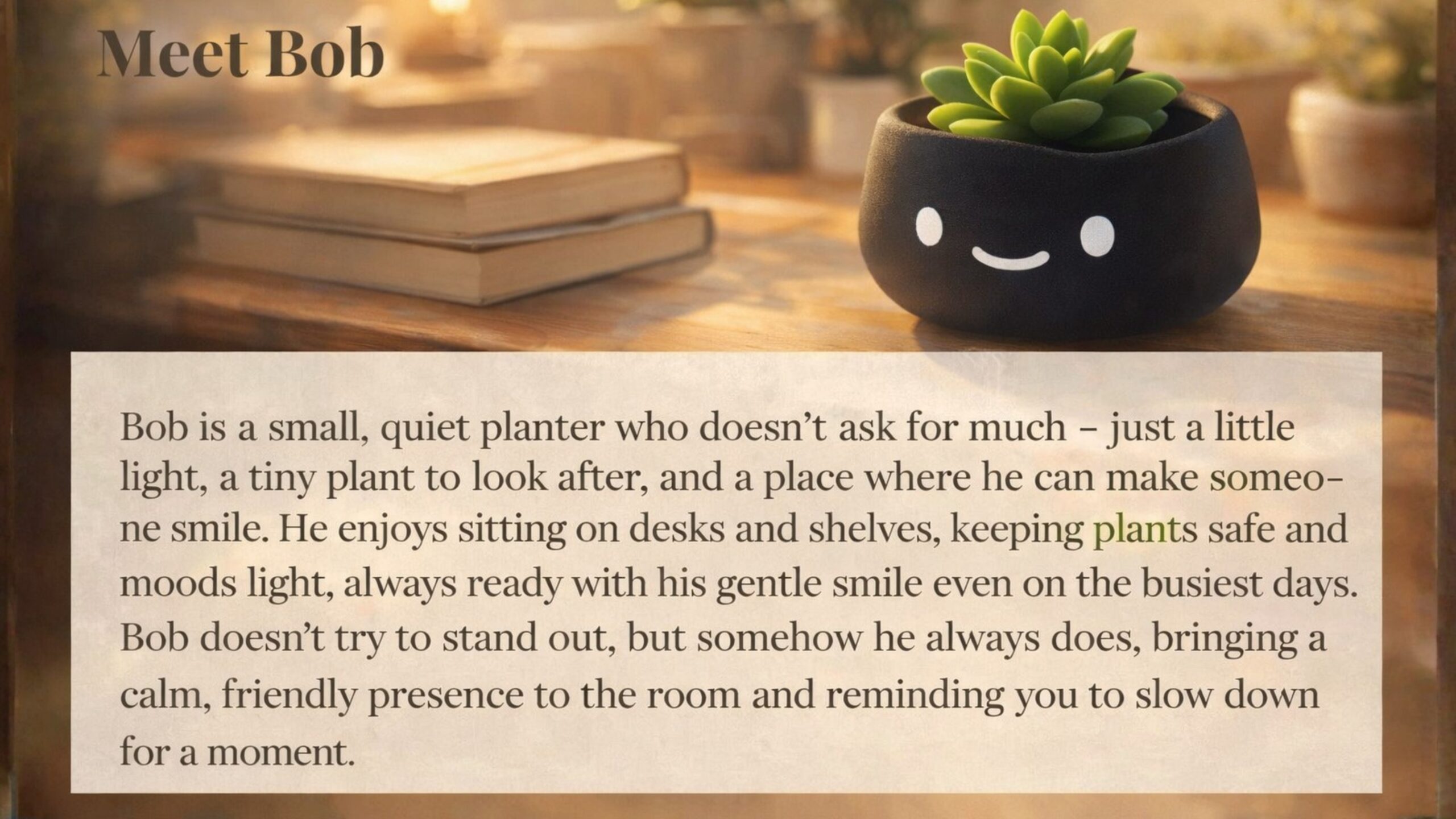 Bob is a small, quiet planter who doesn’t ask for much – just a little light, a tiny plant to look after, and a place where he can make someone smile. He enjoys sitting on desks and shelves, keeping plants safe and moods light, always ready with his gentle smile on even the busiest days. Bob doesn’t try to stand out, but somehow he always does, bringing a calm, friendly presence to the room and reminding you to slow down for a moment.